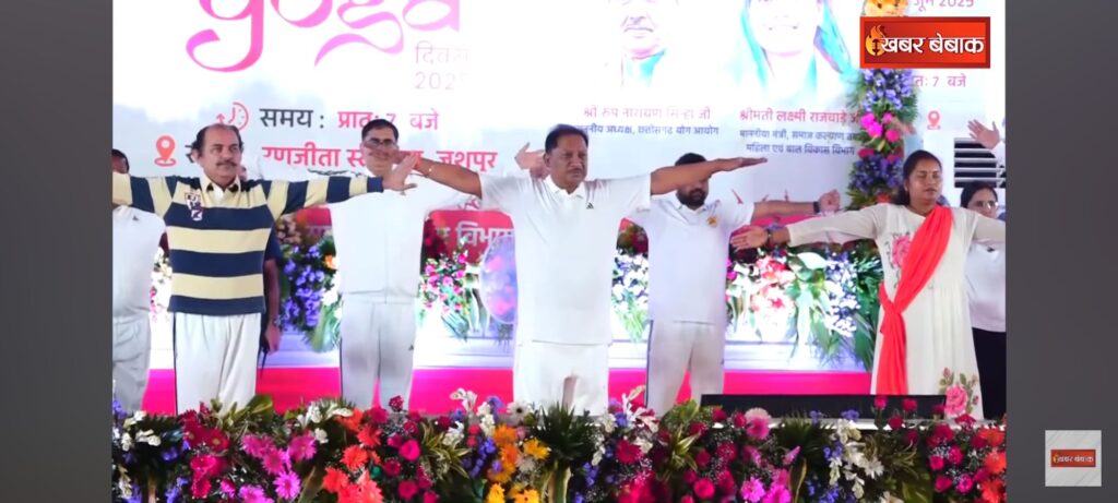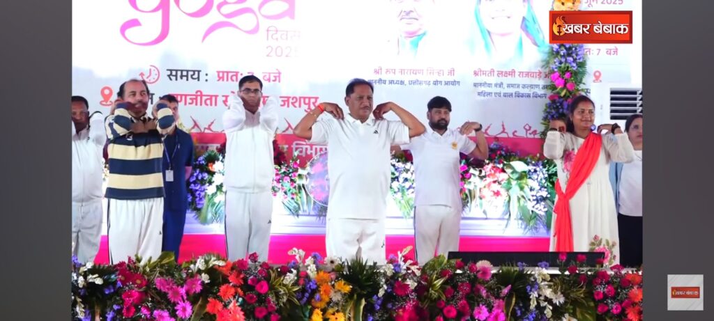 अंतरराष्ट्रीय योग दिवस के अवसर पर जशपुर के रंजीता स्टेडियम में एक भव्य योग कार्यक्रम का आयोजन किया गया। इस समारोह में छत्तीसगढ़ की महिला एवं बाल विकास मंत्री श्रीमती लक्ष्मी राजवाड़े ने बतौर मुख्य अतिथि शिरकत की। कार्यक्रम में मुख्यमंत्री विष्णु देव साय, स्थानीय जनप्रतिनिधि, अधिकारीगण तथा बड़ी संख्या में नागरिक एवं स्कूली छात्र-छात्राएं उपस्थित रहे।
