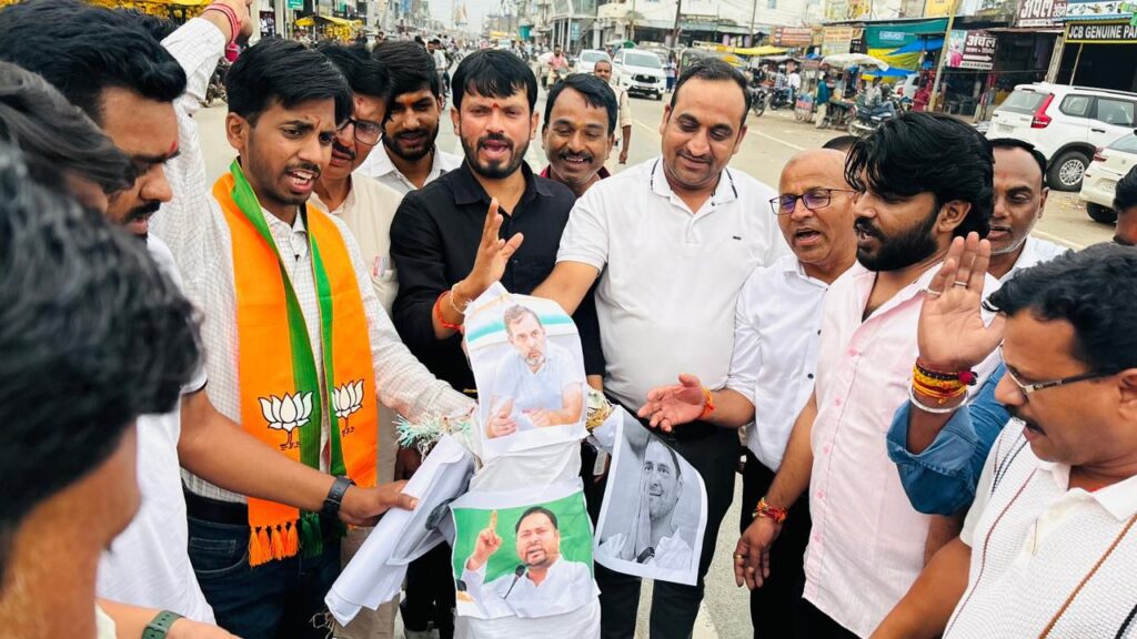 सूरजपुर। छत्तीसगढ़ भारतीय जनता युवा मोर्चा द्वारा प्रदेश नेतृत्व के आह्वान व भाजपा प्रदेश अध्यक्ष किरण सिंह देव एवं युवा मोर्चा के नवनियुक्त प्रदेश अध्यक्ष राहुल योगराज टिकरिया जी, युवा मोर्चा प्रभारी व बेलतरा विधायक सुशांत शुक्ला, सह प्रभारी वैभव बैंस के द्वारा वर्चुअल बैठक में प्राप्त निर्देशन पर टीम युवा मोर्चा जिला सूरजपुर के ऊर्जावान युवा जिला अध्यक्ष रविंद्र भारती के नेतृत्व व भाजपा जिला अध्यक्ष मुरली मनोहर सोनी के मार्गदर्शन में विगत दिनों बिहार के दरभंगा में कांग्रेस और आरजेडी द्वारा आयोजित वोटर अधिकार यात्रा कार्यक्रम के संयुक्त मंच से घोर निंदनीय शब्दों का उपयोग कर देश के यशस्वी प्रधानमंत्री माननीय श्री नरेंद्र मोदी जी की दिव्यांगत माता जी पर अभद्र भाषा (गाली) का प्रयोग कर भारत देश की उन सभी मातृशक्तियो अपमान किया गया। जिसके विरोध में सूरजपुर जिला मुख्यालय के अग्रसेन चौक सहित जिला के सभी मंडलों व ब्लॉक मुख्यालयों पर दोनों संस्कारहीन पार्टियों व उनके स्तरहीन दोनों नेताओं का पुतला जलाकर देश के प्रधानमंत्री व देश की उन सभी मातृशक्ति का अपमान नहीं सहेगा हिन्दुस्तान के नारों के साथ गहरी निंदा व्यक्त करते हुए कांग्रेस पार्टी मुर्दाबाद, राहुल गांधी मुर्दाबाद, देजस्वी यादव मुर्दाबाद, आरजेडी मुर्दाबाद की चिलाहहट की शोर के साथ सूरजपुर जिले की युवा शक्तियों के द्वारा सभी स्थानों पर जबरदस्त विरोध प्रदर्शन करते हुए पुतला फूंका गया। जहां काफी संख्या में पुलिस प्रशासन की टीम भी उपस्थिति रही और पुतले में लगी आग को बाल्टी भर भर पानी से बुझाने के साथ ही युवा मोर्चा कार्यकर्ताओं के साथ काफी धक्का मुक्की कर पुतले को छीनने का भी प्रयास किया गया मगर युवा मोर्चा नेताओं की ठोस घेराबंदी के कारण पुलिस का प्रयास पूर्णतः असफल रहा और घेरे के बीच में कांग्रेस नेता राहुल गांधी एवं आरजेडी नेता तेजस्वी यादव का पुतला धू धू कर जलता रहा जिसपर युवा नेताओं ने विरोध में नारे और जमकर लात जूते भी चलाए।