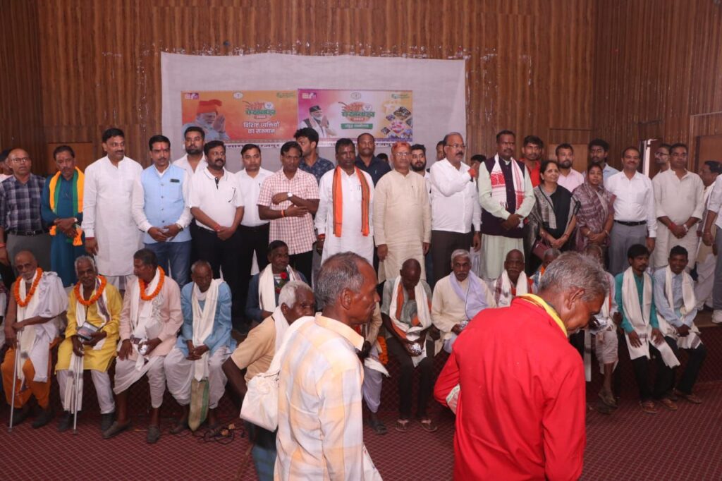 सूरजपुर 20 सितंबर 2025/सेवा पखवाड़ा के तहत तिलसिवां स्थित ऑडिटोरियम भवन में आज प्रबुद्ध वर्ग संवाद व वरिष्ठ नागरिक सम्मान कार्यक्रम का आयोजन किया गया था। कार्यक्रम में बड़ी संख्या में जनप्रतिनिधि, अधिकारी एवं गणमान्य नागरिक उपस्थित हुए। इस अवसर पर वरिष्ठ नागरिकों, सेवानिवृत्त शिक्षकों व प्रबुद्धजनों का सम्मान कर सेवा भाव का संदेश दिया गया। कार्यक्रम मे जिले के गणमान्य नागरिकों को प्रधानमंत्री श्री नरेंद्र मोदी के संदेश से अवगत कराया गया, इसके साथ ही जनसेवा भावना से प्रेरित लघु फिल्म का प्रदर्शन भी किया गया।