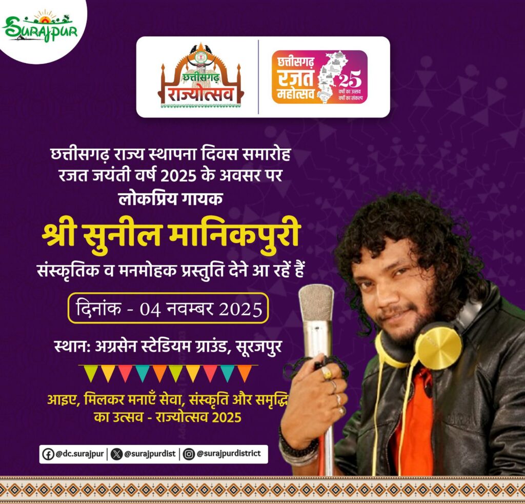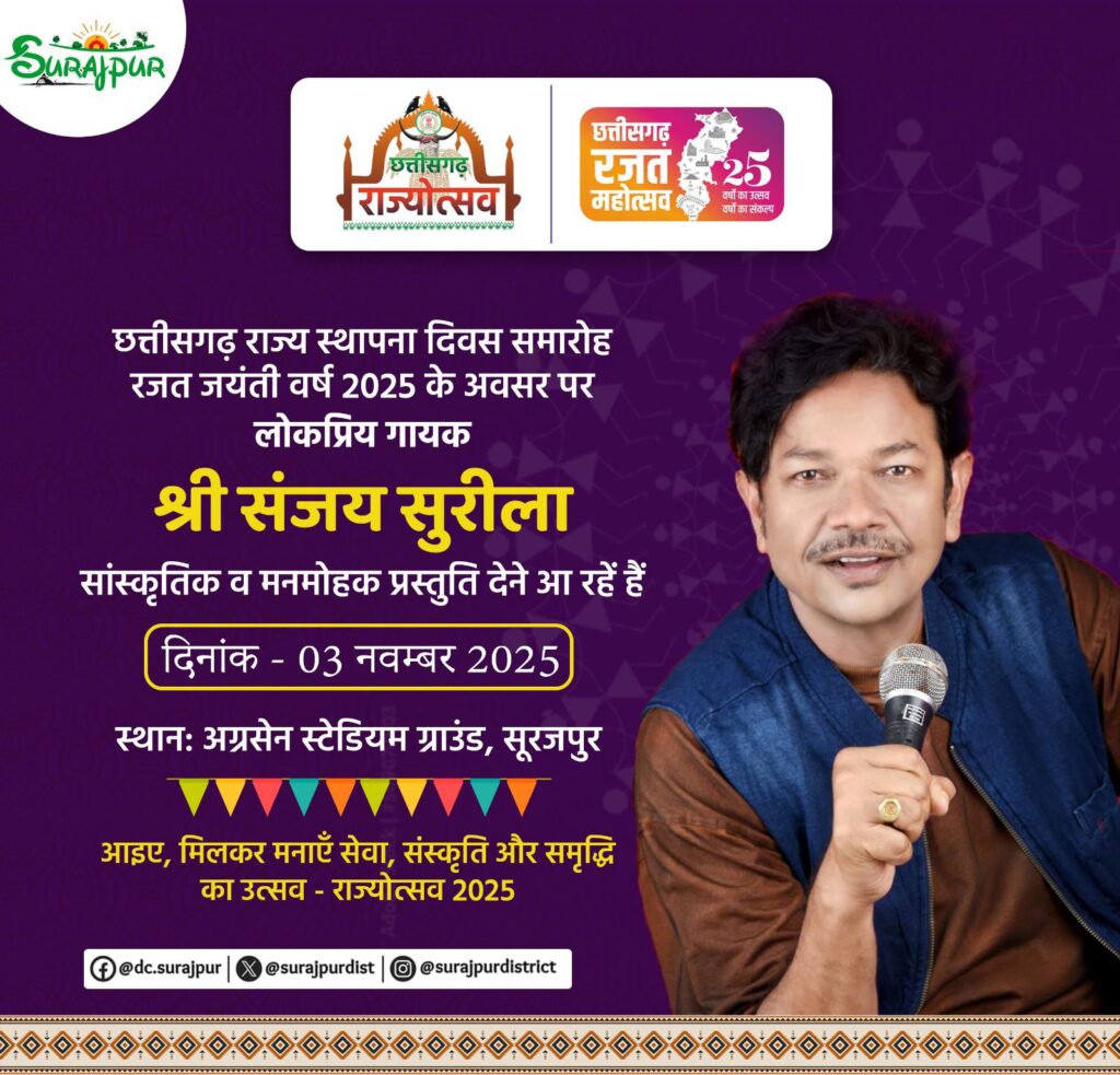 सूरजपुर/31 अक्टूबर 2025/ छत्तीसगढ़ राज्य स्थापना के रजत महोत्सव के अवसर पर सूरजपुर जिले में 02 नवंबर से 04 नवंबर तक तीन दिवसीय जिला स्तरीय राज्योत्सव कार्यक्रम का भव्य आयोजन किया जा रहा है। यह आयोजन सूरजपुर के बालक उच्चतर माध्यमिक विद्यालय के समीप स्थित स्टेडियम ग्राउंड में संपन्न होगा, जिसमें छत्तीसगढ़ की लोक संस्कृति, कला और परंपरा की मनमोहक झलक देखने को मिलेगी।