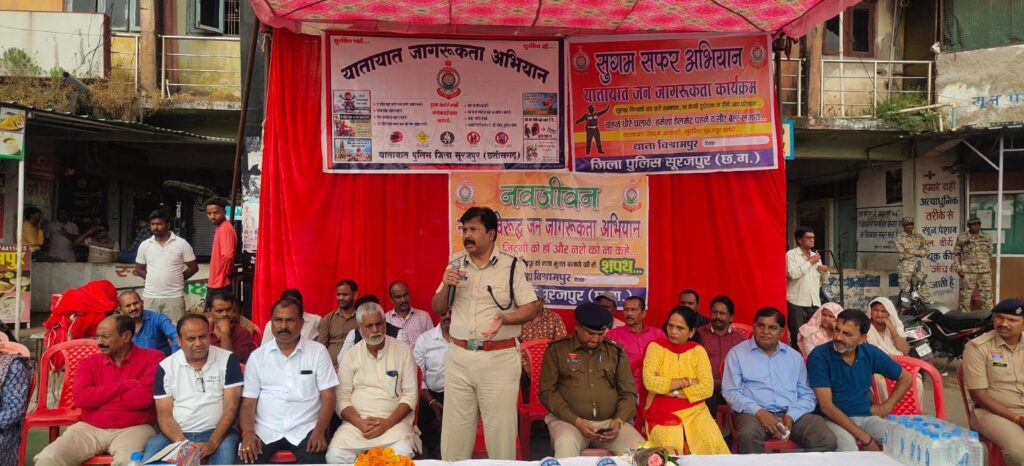 सूरजपुर। डीआईजी व एसएसपी श्री प्रशांत कुमार ठाकुर के निर्देश पर सुगम सफर अभियान के तहत् जिले में यातायात सुरक्षा जन जागरूकता का महाअभियान 1 से 15 नवम्बर 2025 तक चलाया जा रहा है। इसी परिप्रेक्ष्य में गुरूवार, 06 नवम्बर 2025 को बस स्टैण्ड विश्रामपुर में यातायात जन जागरूकता का आयोजन किया गया जहां सड़क दुर्घटना के पीड़ित परिवार व जनप्रतिनिधियों ने सड़क हादसों में अपनों को खोने की पीड़ा क्या होती है उसे साझा करते हुए लोगों से हेलमेट पहनने और यातायात नियमों का पालन करने की अपील की। डीआईजी व एसएसपी ने हेलमेट लगाकर बाईक चलाने वालों को गुलाब फूल देकर एवं माला पहनाकर सम्मानित किया।