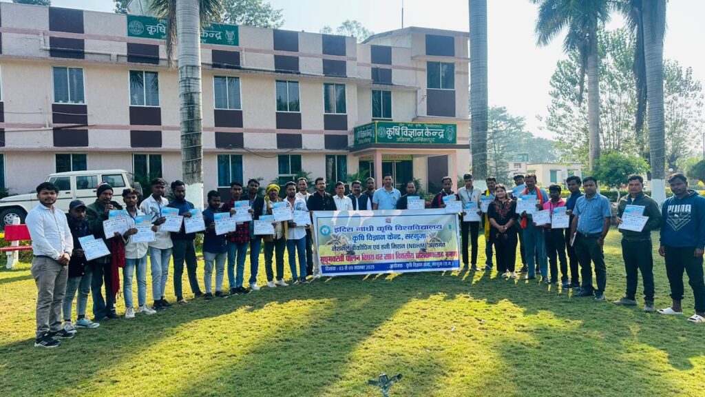 मार्गदर्शन में कृषि विज्ञान केन्द्र सरगुजा के प्रांगण में नेशनल बीकीपिंग एवं हनी मिशन (NBHM) अंतर्गत मधुमक्खी पालन विषय सात दिवसीय प्रशिक्षण 03 नवम्बर से 09 नवंबर तक दिया गया। समापन दिवस पर वर्चुअल माध्यम से ऑनलाइन प्रतापपुर विधायक श्रीमती शकुंतला सिंह पोर्ते भी जुड़ी थी। जहां उन्होंने मधुमक्खी पालन से जुड़ने के कृषक बंधुओं को प्रेरित किया और इससे अतिरिक्त आय का सृजन करने की बात कही ।