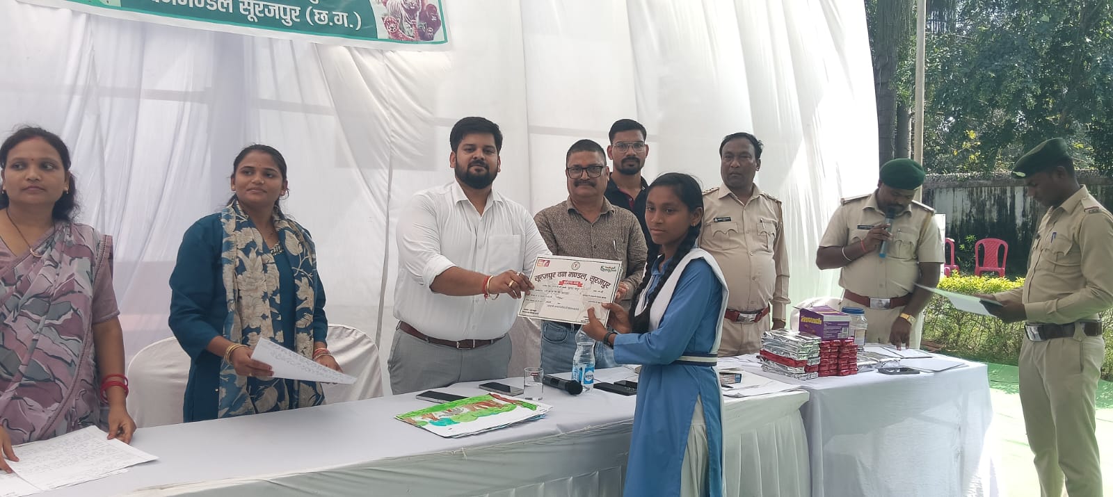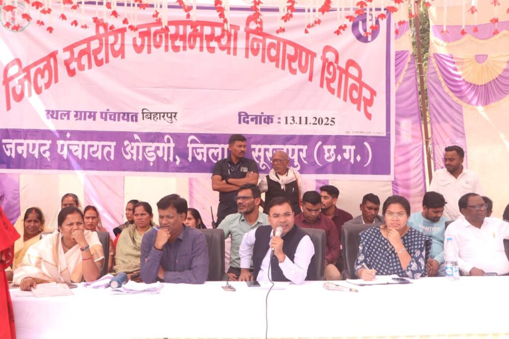सूरजपुर/13 नवम्बर 2025/ आज जिले के ओड़गी जनपद अंतर्गत बिहारपुर के शासकीय महाविद्यालय ग्राउन्ड में जिला स्तरीय जनसमस्या निवारण शिविर का आयोजन महिला बाल विकास मंत्री श्रीमती लक्ष्मी राजवाड़े के मुख्य आतिथ्य में किया गया। आयोजित शिविर में मंत्री श्रीमती राजवाड़े एवं कलेक्टर श्री एस जयवर्धन द्वारा लोगों से संवाद कर उनके समस्याओं एवं शिकायतों को सुना गया। शिविर में जिलाधिकारियों द्वारा अपने विभाग की योजनाओं की विस्तृत जानकारी भी दी गई। इस दौरान शिकायतों एवं समस्याओं को लेकर 971 आवेदन प्राप्त हुए। इस अवसर पर कलेक्टर ने सभी लोगों से शिविर का ज्यादा से ज्यादा लाभ उठाने का आग्रह किया। इस अवसर पर जनप्रतिनिधियों सहित जिला पंचायत सीईओ और विभिन्न विभागों के जिला स्तरीय अधिकारी एवं अन्य जनप्रतिनिधि उपस्थित थे।