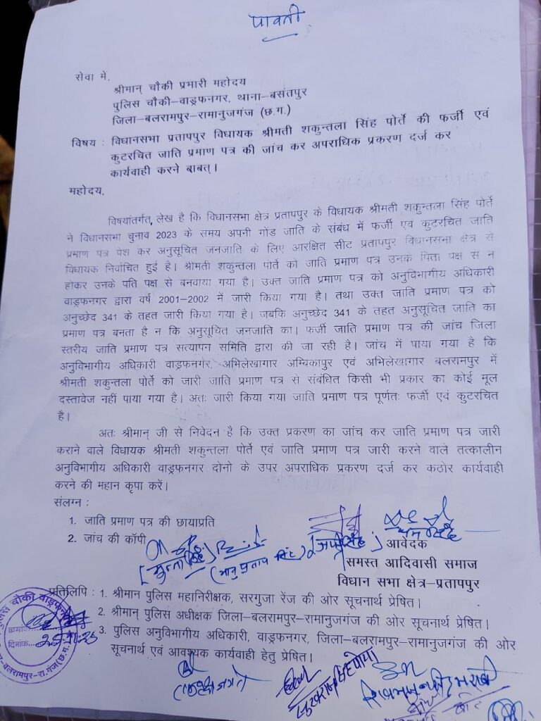 छत्तीसगढ़ के प्रतापपुर विधानसभा क्षेत्र से एक बड़ा विवाद सामने आया है। स्थानीय आदिवासी समाज के प्रतिनिधियों ने प्रतापपुर विधायक शकुंतला सिंह पोर्ते पर फर्जी एवं कूटरचित जाति प्रमाण पत्र का उपयोग करने का गंभीर आरोप लगाते हुए वाड्रफनगर पुलिस चौकी में लिखित शिकायत दर्ज कराई है।